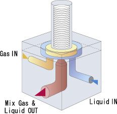 This is the vaporization method used in the MI/MV series. Since the pressure on the carrier gas is higher at the front of the nozzle inside the injector, it can be heated efficiently. The liquid source and the heated carrier gas are mixed together in the gas/liquid mixing area in the front of the nozzle, and the pressure is reduced as they pass through the nozzle, vaporizing the mixture. Vaporization efficiency is higher than with traditional vaporization methods. When this method is used, larger flows can be generated, and the generation temperature can be reduced.