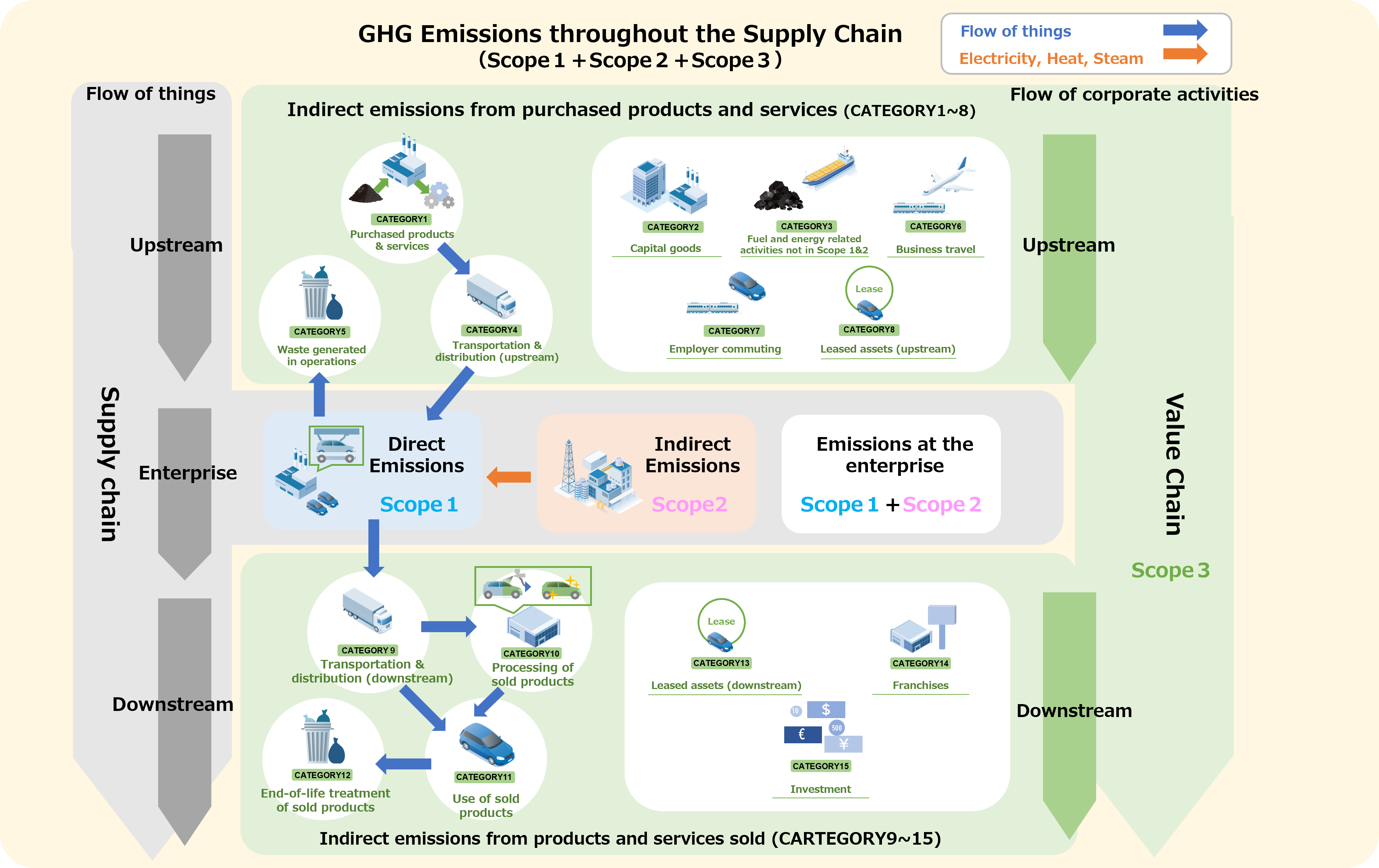 The GHG Protocol is a guideline published by the GHG Protocol Initiative. This protocol classifies the entire supply chain of customers into three scopes, called Scope 1, 2, and 3, and calculates the total GHG emissions for each scope, thereby determining the GHG emissions for the entire corporate activity (entire supply chain).