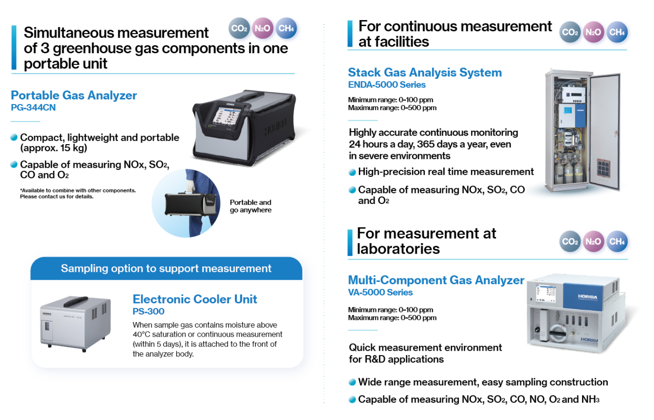 GHGs include carbon dioxide (CO2), methane (CH4), nitrous oxide (N2O), and fluorocarbons. Continuous measurement of GHGs in exhaust gases is an effective means for investigating, planning, implementing, and evaluating GHG reductions. In particular, the reduction and management of N2O, which has 298 times the greenhouse effect of CO2, is required in various industries. For example, when reducing N2O using the latest equipment such as thermal decomposition gasification treatment, it is important not only to monitor the operating status of the equipment but also to verify and evaluate the effects of the introduction. Continuous measurement of N2O in exhaust gases greatly contributes to such verification and evaluation, as well as to improving the reduction rate.