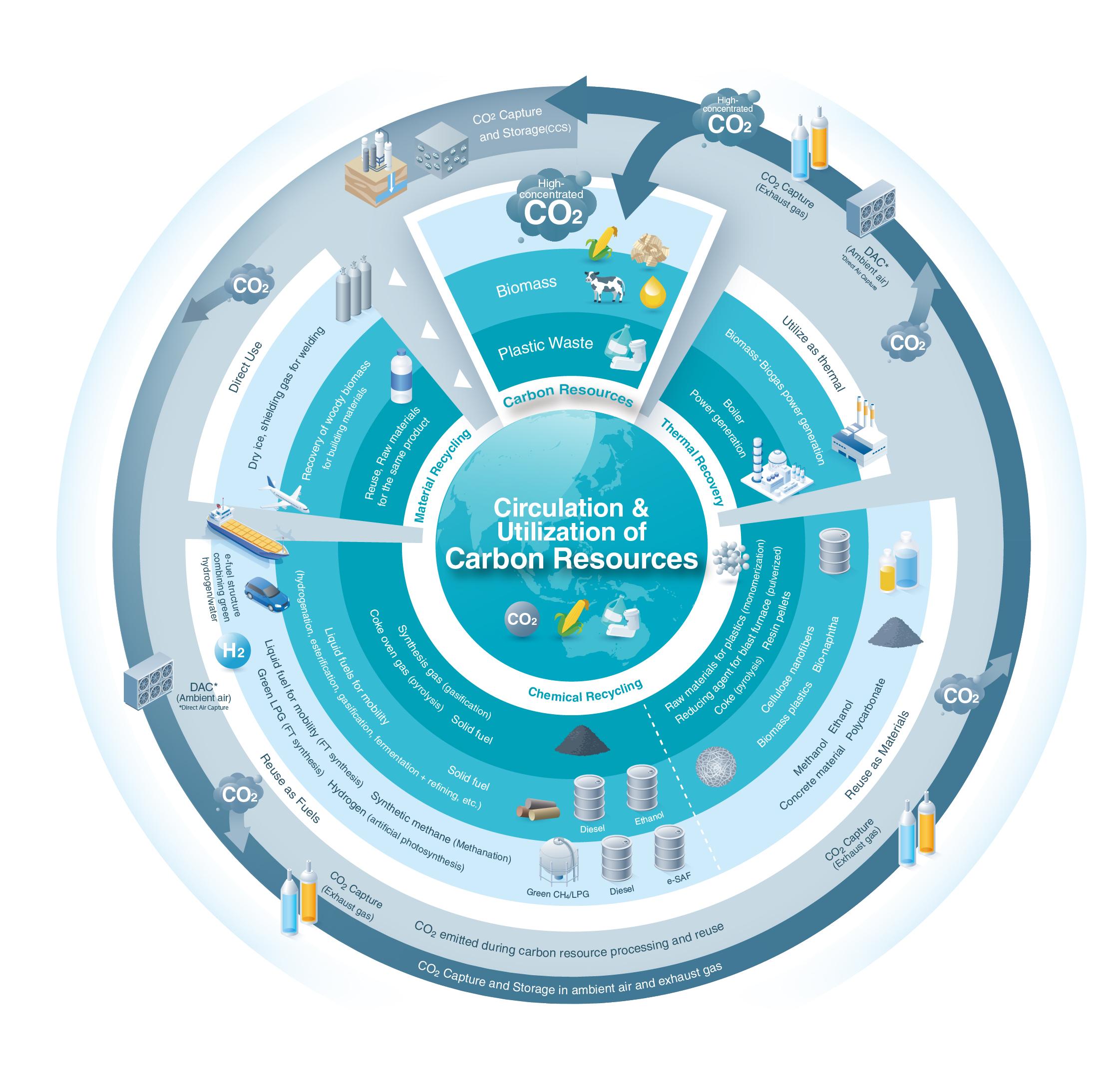 To achieve carbon neutrality,alongside the transition from fossil fossil fuels to renewable energy and carbon-free fuels (such as hydrogen and ammonia), it is also important to reduce CO2 emissions by capturing, storing and fixing various greenhouse gases, such as CO2. Furthermore, making effective use of the recovered CO2 through capturing, storage, sequestration, and recycling along with biomass, plastic waste, and carbon resources is essential. Recycling and the social circulation of carbon resources are expected to contribute to carbon neutrality by ultimately reducing CO2 emissions.