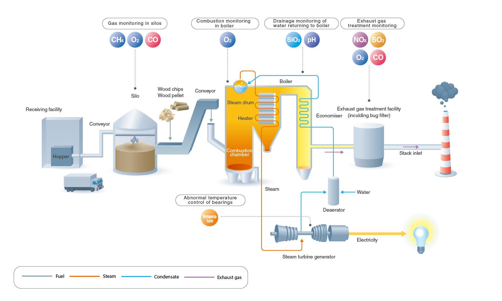 When energy is recovered as heat by burning non-recyclable biomass materials at waste disposal sites or waste incineration plants, the same issues that arise in power generation using plastic waste as fuel in thermal recovery may arise. For more information, please click here: Analysis and Measurement Solutions for Waste Power Generation