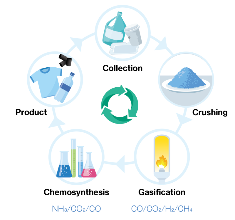 Recycling of plastic waste involves material recycling, where plastic waste is reprocessed into raw materials for new plastics; chemical recycling, where it is gasified to produce hydrogen and synthesis gas for chemical and steel production; and thermal recovery, where plastic waste is used as fuel for different types of power generation and energy recovery.