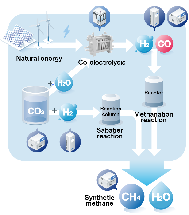 Syngas (hydrogen and CO) production technologies include āreverse shift reaction,ā which converts CO2 to CO, āwater electrolysis,ā which breaks down water into hydrogen and oxygen by electrical force (electrolysis), and āco-electrolysis,ā which simultaneously electrolyzes CO2 and water. In order to put these technologies to practical use and optimize them, various research and development efforts are underway to optimize the production ratio of H2 and CO, improve production energy efficiency, lower production costs including equipment, and improve durability. In āmethanation,ā where methane is produced by synthesizing water-electrolyzed hydrogen and CO2, practical application, and optimization of the methanation process using co-electrolysis, which has less heat loss due to waste heat compared to the Sabatier reaction, is also being promoted. For example, in the research and development of co-electrolysis using Solid Oxide Electrolysis Cells (SOECs), it is important to evaluate SOECs under various environmental and test conditions in order to efficiently produce hydrogen and CO. In addition, to optimize the Sabatier reaction in methanation, it is essential to improve the yield of synthesis methane and the durability of the catalyst used.