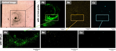 Micro-XRF, a XRF having micro beam spot, is suitable for elemental analysis on small trace evidence such as glass fragments, paint chips, soils, and small gems. Also, it is also capable of elemental distribution imaging by scanning over a sample surface, and it is particularly valuable for visualizing gunshot residue patterns, revealing hidden fingerprints, and analyzing small fragments of glass or tempered documents by different inks.
