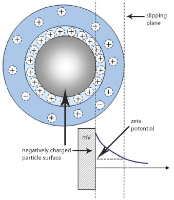Zeta potential refers to the potential in the interfacial double layer (DL) at the location of the slipping plane versus a point in the bulk fluid away from the interface. In other words, zeta potential is the potential difference between the dispersion medium and the stationary layer of fluid attached to the dispersed particle. Since electrostatic interactions are important in many colloidal systems, this measure of electrostatic potential is important for controlling these systems. More details can be found in the zeta potential technology discussion.