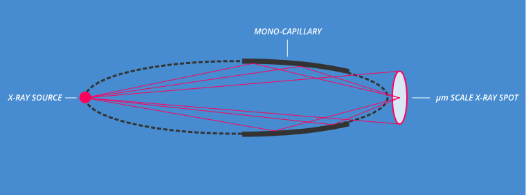 The solid angle from the X-ray source to the capillary is relatively large, which means that coupling between the two is efficient. As a result, very high intensities of X-rays can be channeled into the capillary, and since reflection itself is very efficient, capillaries can be used to generate high intensity micro-beams with diameters as small as 10 µm. The HORIBA X-ray guide tube (XGT) is an example of the successful use of mono-capillaries, and indeed is unique in allowing 10 µm spatial resolution on a bench top system.