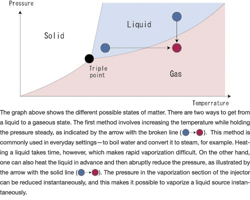 This is the vaporization method used in the MI/MV series. Since the pressure on the carrier gas is higher at the front of the nozzle inside the injector, it can be heated efficiently. The liquid source and the heated carrier gas are mixed together in the gas/liquid mixing area in the front of the nozzle, and the pressure is reduced as they pass through the nozzle, vaporizing the mixture. Vaporization efficiency is higher than with traditional vaporization methods. When this method is used, larger flows can be generated, and the generation temperature can be reduced.