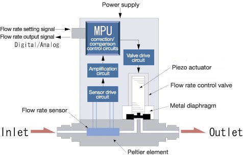 These mass flow controllers have a flow rate measurement section that includes a sensor, bypass, flow rate control valve, and special circuitry. A CPU is part of the circuitry, which makes it both multi-functional and highly efficient.