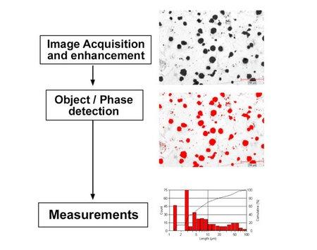 Object/phase detection can be simple for well dispersed particles and can be extended to include special lighting and software algorithms to separate touching particles. The final step is computation of the desired parameters for particle size and shape of each particle. This data is build up to generate a distribution from which population statistics can be extracted.