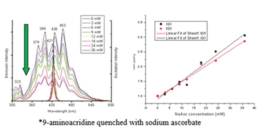 The equation on the right is used where tf is the quantum yield, and kf, knr, and kt are the rate constants of fluorescence, non-radiative dissipation and energy transfer, respectively, τf is the fluorescence lifetime of the sample. PLQY is determined by the rate constants of these non-radiative processes that compete with fluorescence such as FRET and Stern-Volmer quenching.