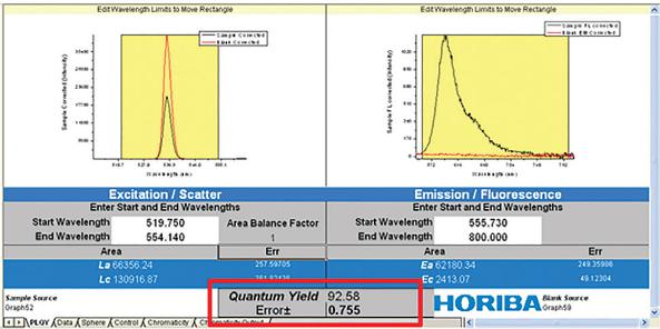 Where Eb is the integrated luminescence from the sample caused by indirect luminescence from the sphere and A is the absorbance of the sample at the excitation wavelength. A simple calculator that incorporates the two traces along with appropriate spectral correction factors is used to give the PLQY and associated error analysis.