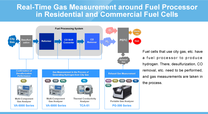 Various gas analyzers that measure the concentration of impurity gases such as CO, CO2, and sulfur gases that lead to the life of fuel cells. Also, the water quality analyzers can measure the pH of waste water to determine the detorioration state of fuel cells. They both contribute to fuel cell development.