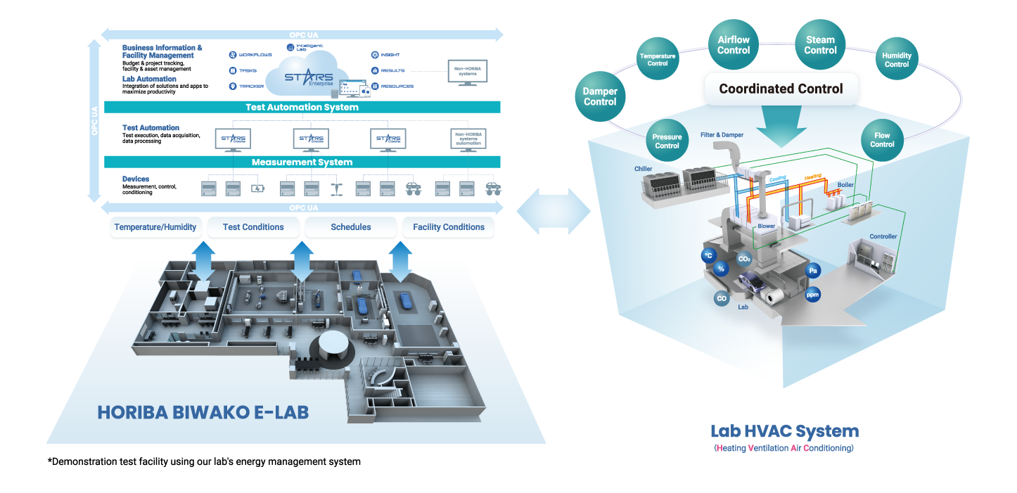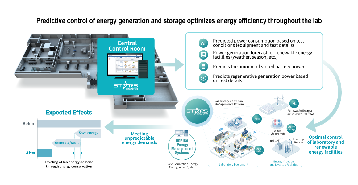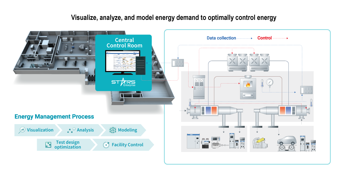 At the core of this energy management technology is integrated lab management system inclucing our proprietary test automation system, STARS Enterprise. This facility adjustment and control solution, designed specifically for R&D centers with large fluctuations in energy demand, achieves significant energy savings based on "visualization and bird's-eye view of facility operation," "pattern recognition of demand fluctuation factors," and "coordinated control of R&D facilities" in response to energy consumption patterns of "unreasonableness, wastefulness, and irregularity. We realize significant energy savings.