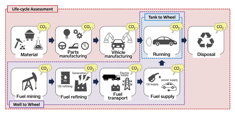 LCA (Life Cycle Assessment) is a method for evaluating the environmental impact of products and services throughout their lifecycle (resource extraction - raw material production - product manufacturing - distribution and consumption - disposal and recycling). LCA is defined by ISO 14040 and 14044. For example, the diagram on the right outlines the LCA for automobiles. Traditionally, the focus was only on CO2 emissions during driving. However, as required by LCA, it is now the responsibility of manufacturers to reduce environmental impact at all stages of the product lifecycle, from fuel extraction and material procurement to manufacturing, use, disposal, and recycling.