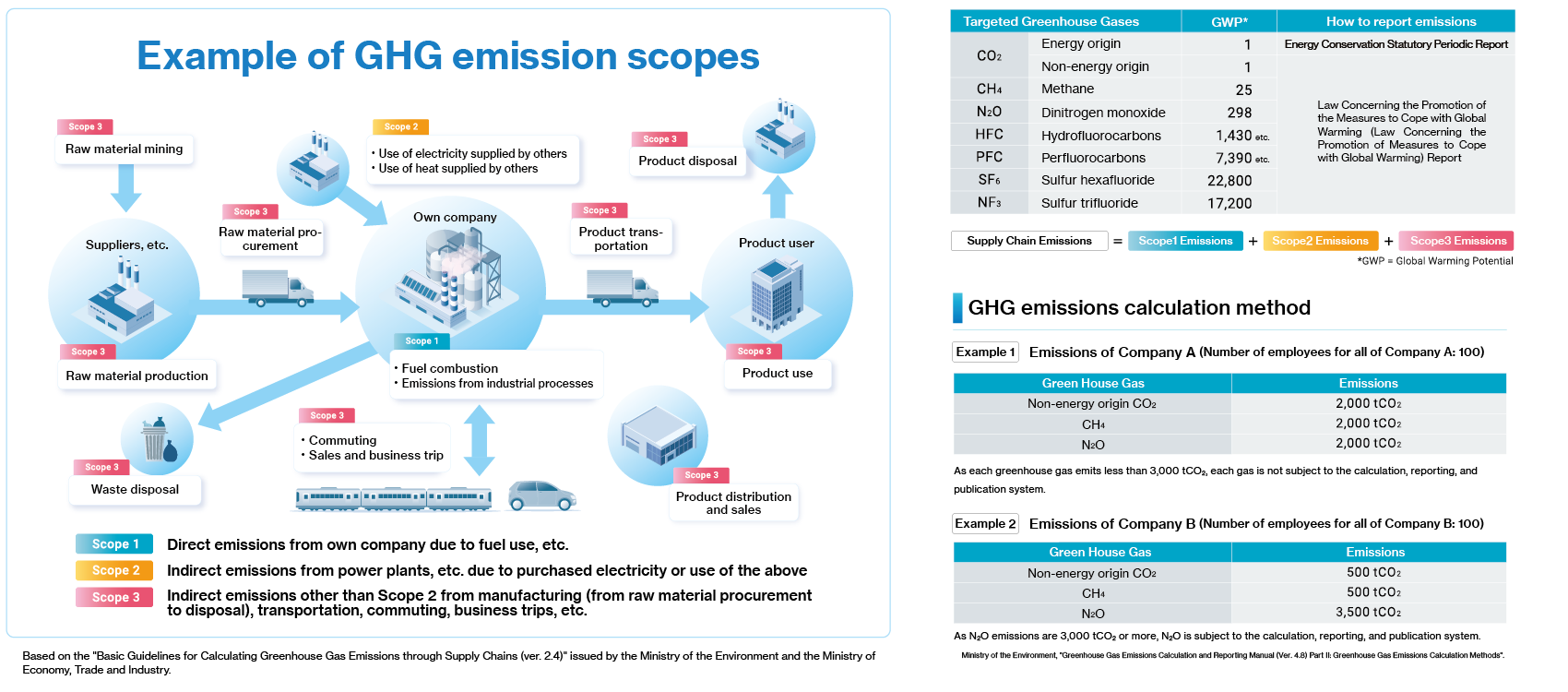 The GHG Protocol is a guideline published by the GHG Protocol Initiative. This protocol classifies the entire supply chain of customers into three scopes, called Scope 1, 2, and 3, and calculates the total GHG emissions for each scope, thereby determining the GHG emissions for the entire corporate activity (entire supply chain).