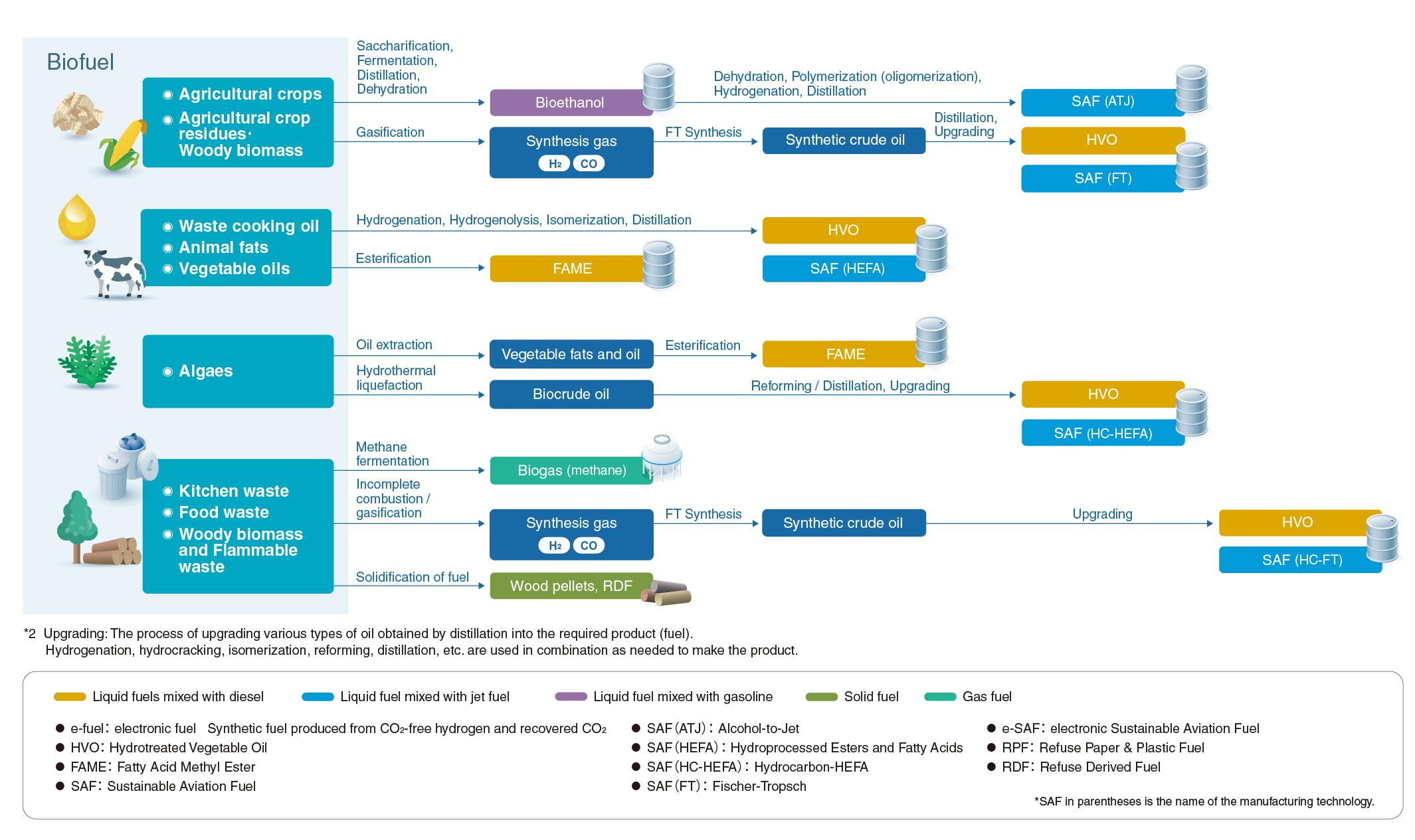 Fuels (biofuels) produced from biomass include bioethanol, biodiesel (FAME: Fatty Acid Methyl Ester), and hydrogenated vegetable oil (HVO: Hydrotreated Vegetable Oil), which are used in blends with conventional fuels, and the blending ratio with conventional fuels is expected to increase in the future. SAF (Sustainable Aviation Fuel), a biofuel for aviation fuel, can be classified into ATJ (Alcohol-to-Jet), HEFA (Hydro-processed Esters and Fatty Acids) FT (Fischer-Tropsch), etc., depending on the raw materials used and the manufacturing process, and the maximum blending ratio with conventional fuels is determined. In order to promote higher blending rates and substitution, it is necessary to establish and improve the supply chain to secure stable feedstock and supply, in addition to reducing the production cost, increasing calorific value, and reducing corrosiveness of biofuels.