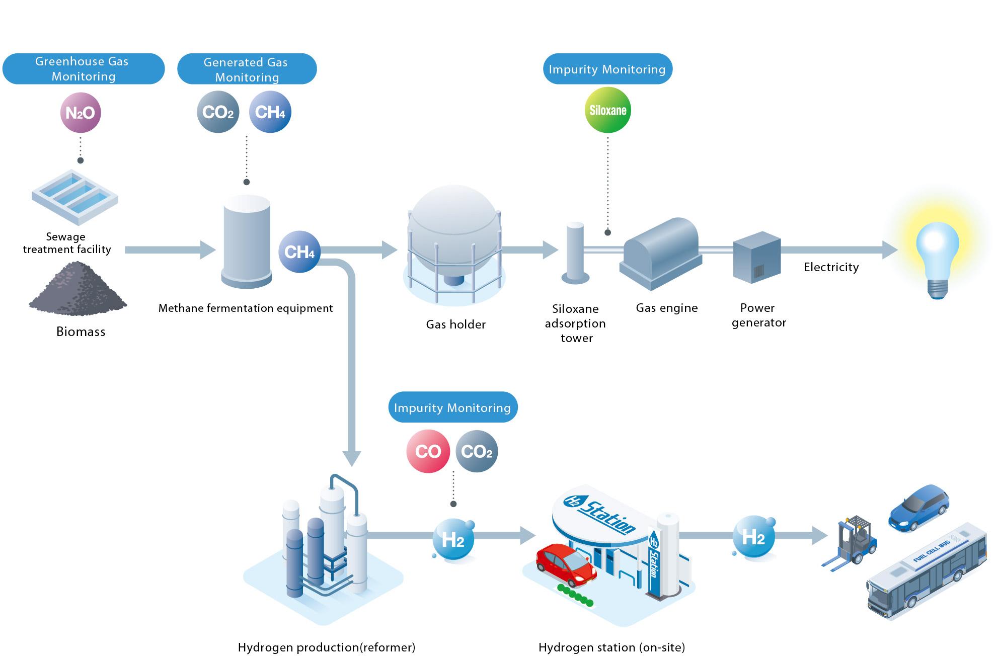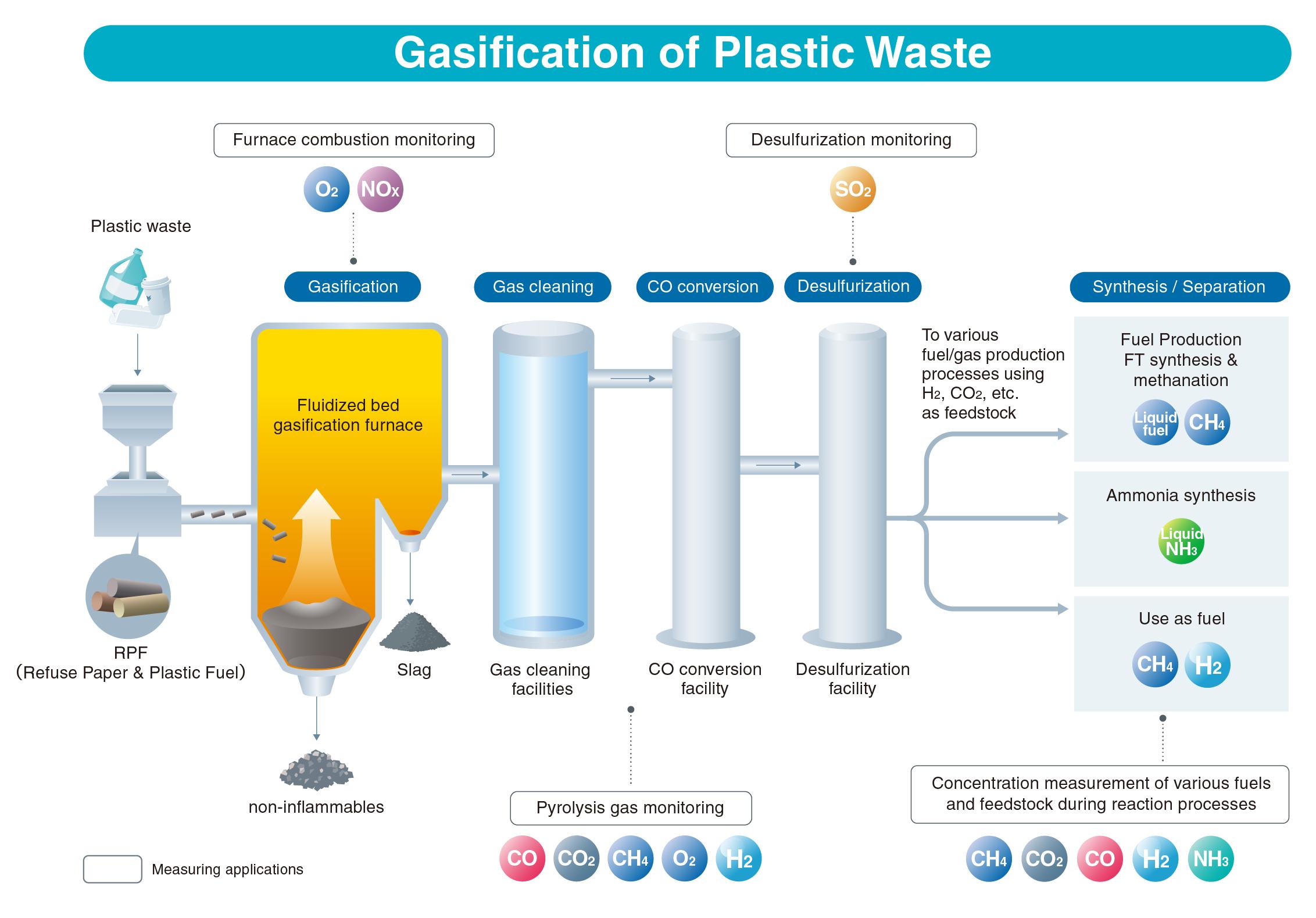 Research and development are also underway to link chemical recycling and next-generation alternative energy production, such as the production of ammonia (NH3) from the produced hydrogen. For safe and highly efficient gasification, continuous measurement of generated gas, added gas, impurity gas, exhaust gas, etc. at gasifiers and other process facilities is necessary.