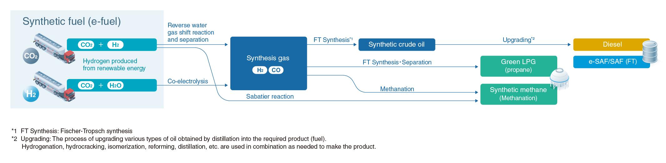 Typical CO2 recycling includes āsynthetic fuel,ā which is produced by reacting hydrogen produced by electrolyzing water with recovered CO2 using renewable energy, methane (CH4) production called āmethanation,ā production of chemicals using CO2 as raw material, and production of hydrogen and organic compounds by āartificial photosynthesisā combining sunlight, water, and CO2. photosynthesis, which combines sunlight, water, and CO2 to produce hydrogen and organic compounds.