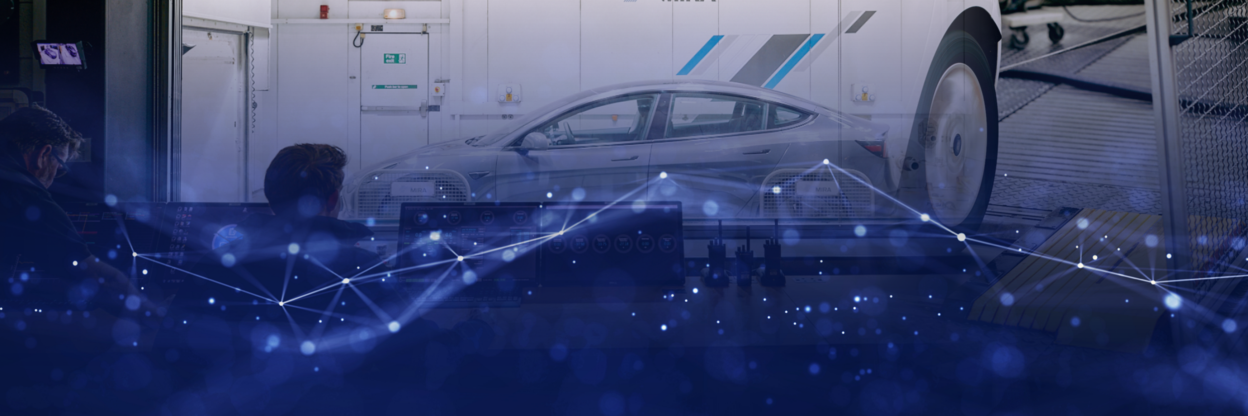 Electric vehicle performing a road-to-rig replication test on a chassis dynamometer within a test cell at the HORIBA Automotive.