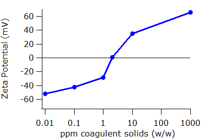 As coagulant is added, the zeta potential approaches zero. There is an additional, and for this application, critical point in the data shown below. At one concentration of coagulant, the zeta potential reaches zero. This concentration is known as the iso-electric point. Then, with increasing coagulant concentration, the net charge on the particle becomes positive. Too much coagulant restabilizes the suspension but now with the opposite charge. The danger in adding too much coagulant is not merely the additional cost in reagents, but also that the treatment process will become ineffective.
