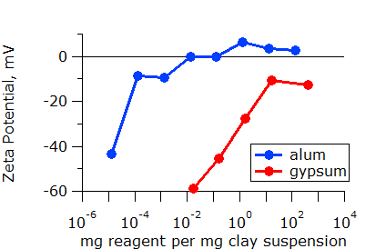 It is not always obvious which additive is best. More effective additives are often more expensive. Thus, knowing the required dose of each additive is critical to making the best decision. Once again, zeta potential measurements can make the choice clear. In the plot below, it is clear that about 100 times less gypsum is required than alum for this material. This is not unexpected as the trivalent aluminum ion (Al3+) in alum is known to be more effective than the divalent calcium ion (Ca2+) in gypsum.