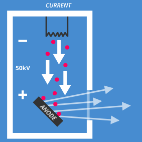 A typical X-ray generator passes an electric current through a filament, which causes electrons to be emitted. These electrons are then accelerated by high voltage (usually somewhere between 20 and 100kV) towards an anode (target). The deceleration of the electrons when they hit the anode causes a broad X-ray continuum to be emitted. This radiation is known as bremsstrahlung (German: braking radiation). In addition, a fraction of the electrons will cause characteristic X-ray fluorescence from the anode material.